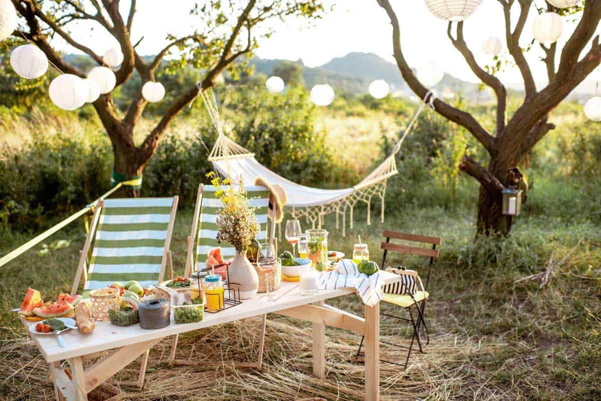 Yeah, the image of a classic red-checkered blanket is cute. But unless you want your guests awkwardly balancing plates on their knees or sitting on roots, plan for some real seating.