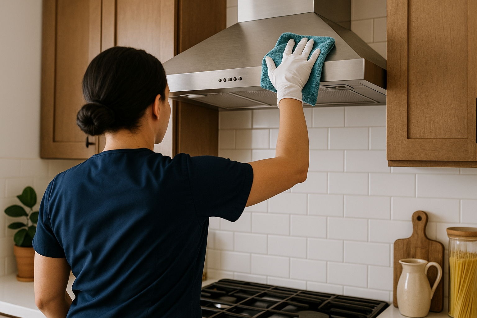 Kitchen grease is one of the clearest examples of hot water doing useful work. Airborne cooking oils settle on cabinets, backsplashes, microwave doors, and vent hoods. Over time, dust sticks to the oily layer and turns it into a dull, tacky coating.