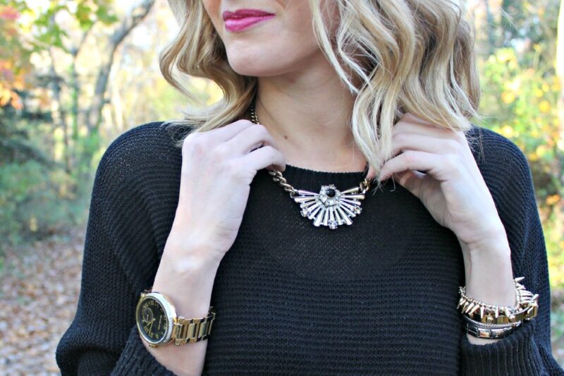 - An all-black outfit with a polished silver pendant.