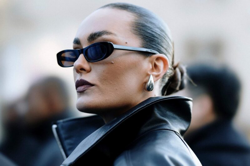 - A charcoal leather jacket with brushed steel earrings.